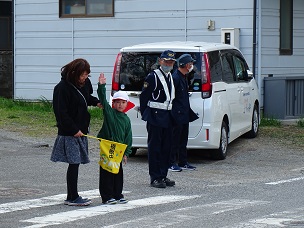 「右、左、右、車は来ない」と、低学年の子どもたちは声に出しながら車を確認して渡っていました。