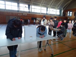 発表して、3年生以上の全員で会長にふさわしいと思う人を選ぶという方式の選挙です。