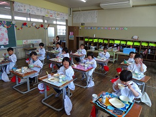 「今日は、全て自分たちで盛り付けをすることができました」1年生の給食